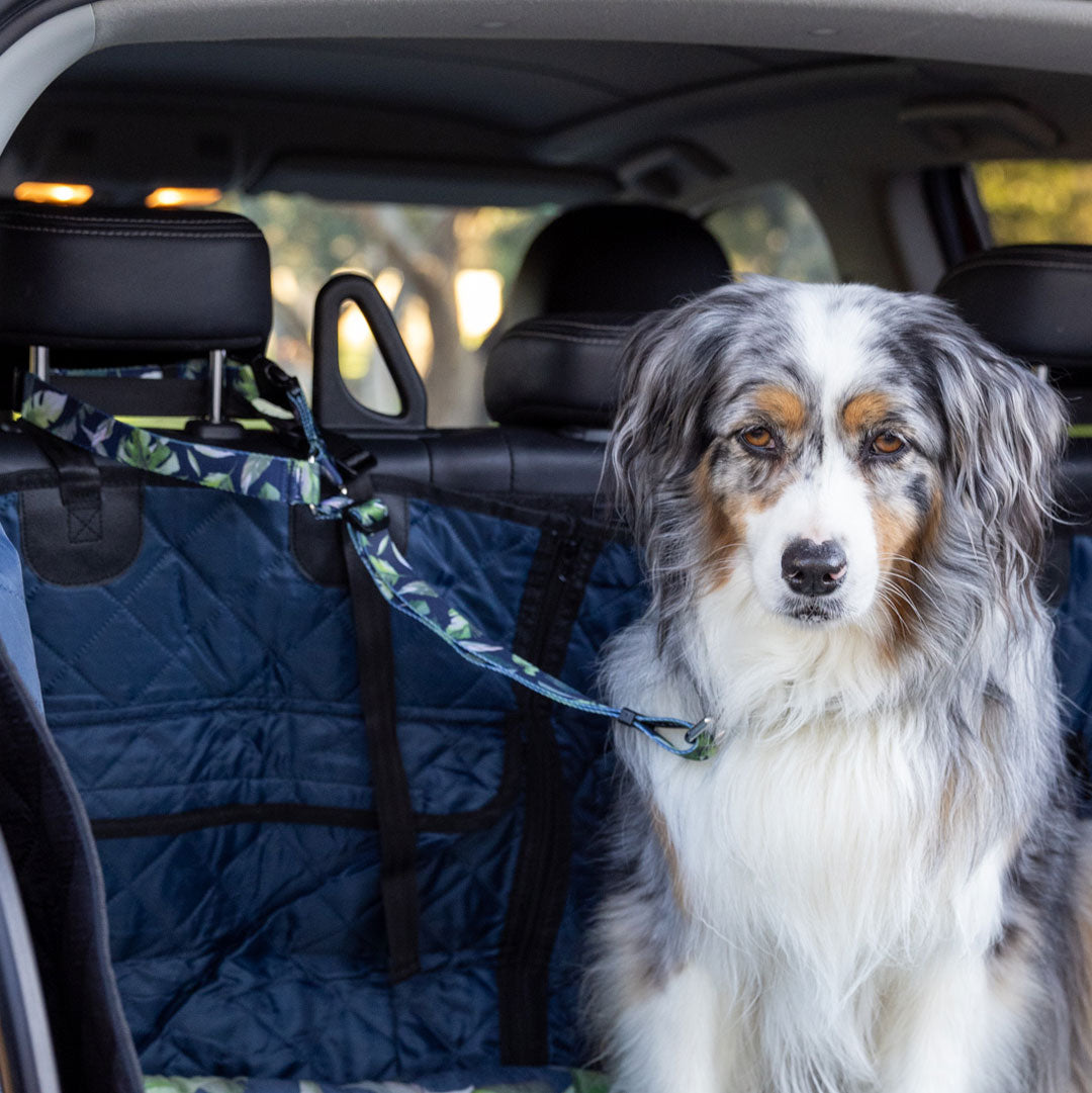 SAFETY FIRST! Put you and your dog's safety first by ensuring that your furry friend is always secure when they travel with you. Our headrest car restraints secure firmly to your dog's harness to prevent them from jumping in the car, jumping in front of you, and keeping them safe on all your adventures. Make sure you are matchy-matchy with our Stylish Hound car seat cover or boot covers! • All materials (straps, plastic buckles, metal hardware) are made from 100% recycled materials • Quality stainless steel hook to secure onto your dog's harness • Double-sided print • Fully adjustable • Lockable Buckle clip