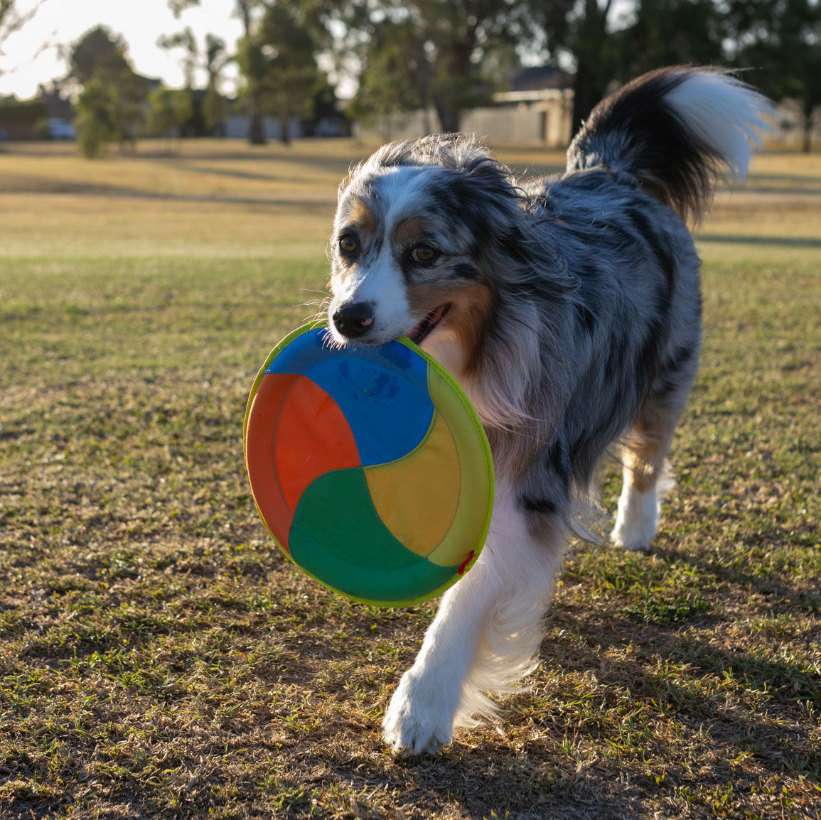 Although this frisbee looks great with its vibrant colours and seems to be sewn together well, It barely flies - it really shouldn’t be considered a frisbee. When thrown it tends to just plummet downwards and has hit my dog hard in the face several times. I’ve stopped using it for this reason. I’ve bought other frisbees from different brands that glide much better and are easier for my dog to catch/pick up from the ground. This one unfortunately did not meet expectations.