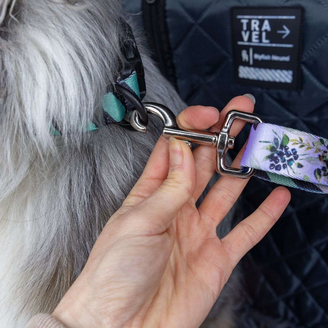 • All materials (straps, plastic buckles, metal hardware) are made from 100% recycled materials • Quality stainless steel hook to secure onto your dog's harness • Double-sided print • Fully adjustable • Lockable Buckle clip