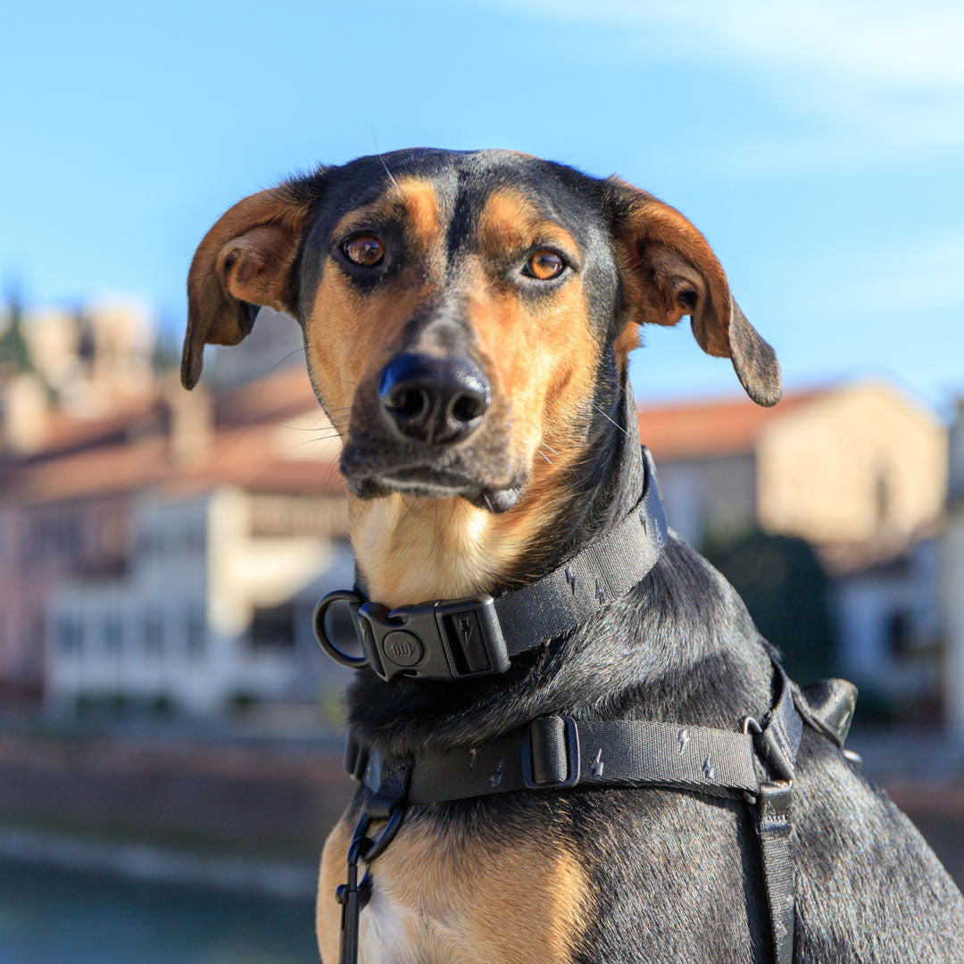 • Silky polyester finish that is soft on your dog's fur • Gel Silicone Lightning Print • Sturdy hardware clip • Adjustable • Lockable Buckle • Some black metal hardware coated in thin layer of recycled plastic to prevent black colour being scratched off - the inner core is 100% recycled metal.