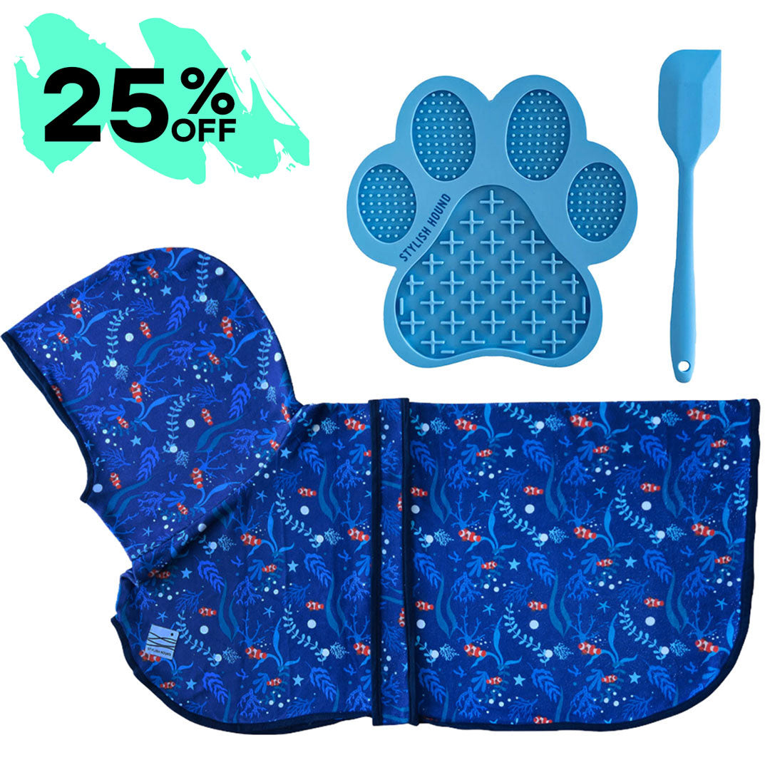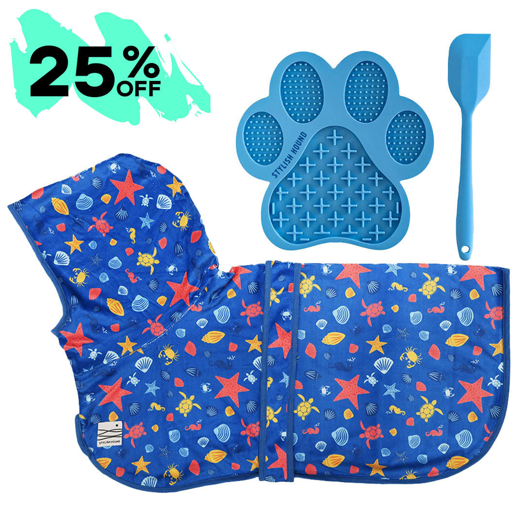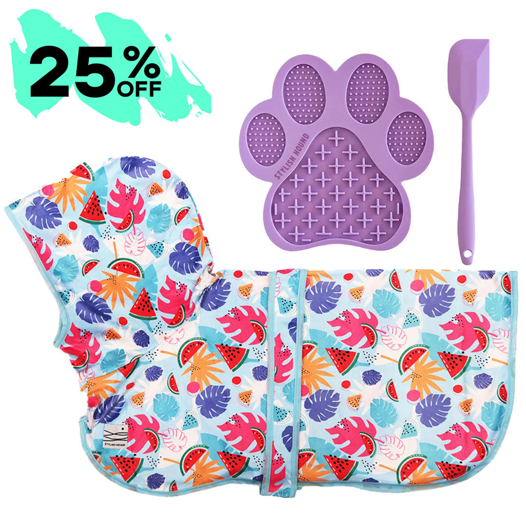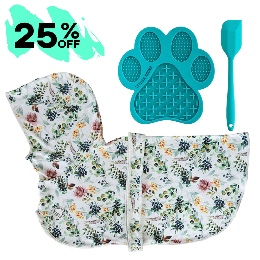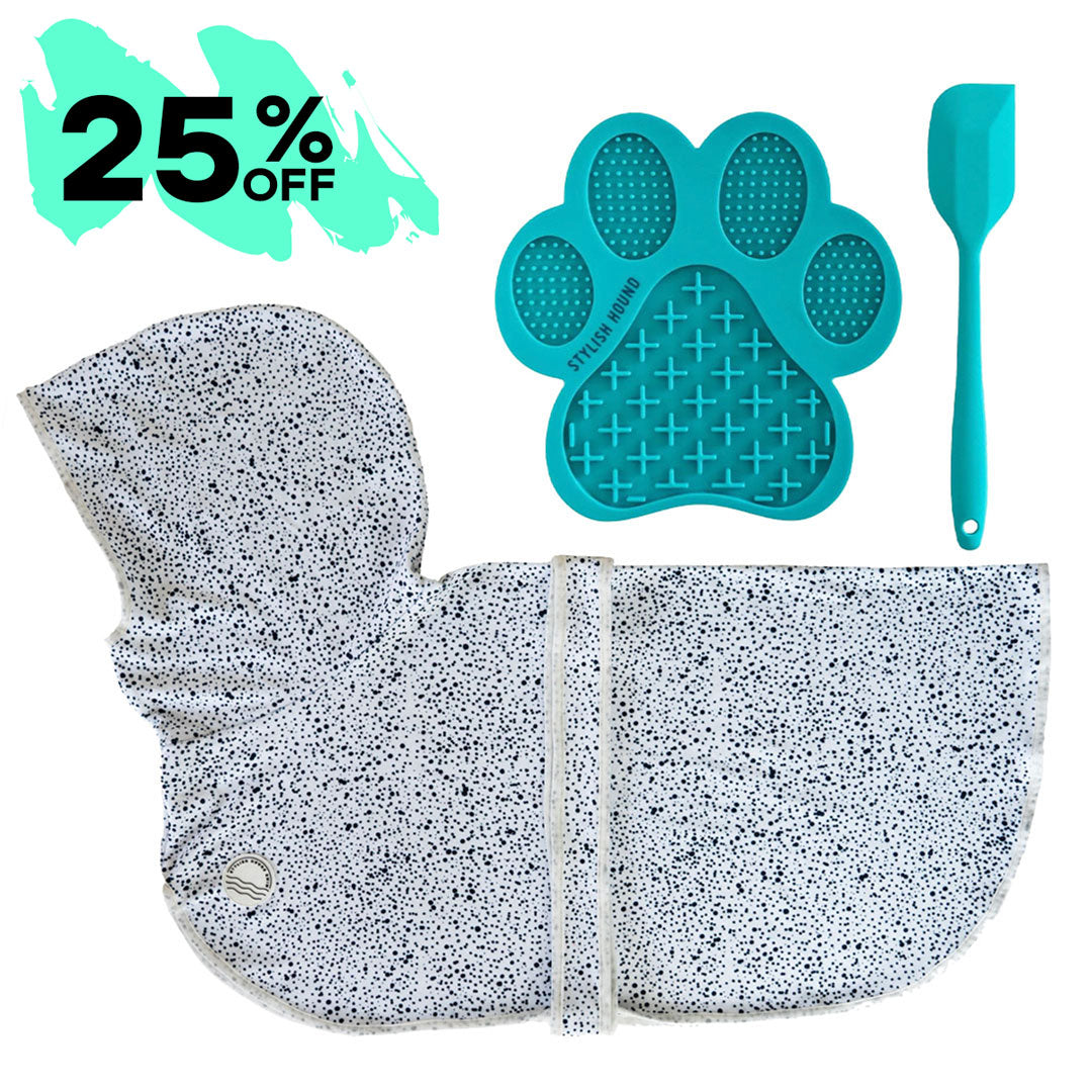 This must-have Grooming Kit includes: 1 x Dog Robe 1 x Lick Bowl or Lick Mat