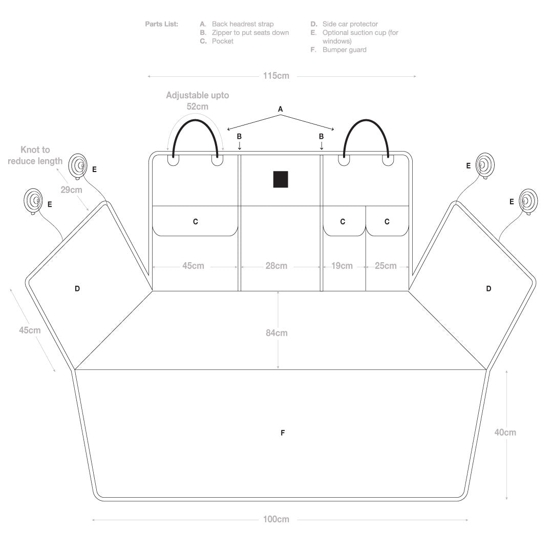 Our stylish hound boot cover will not only keep your car in mint condition, but the anti-slip and padded material also ensures maximum comfort and prevents your pup from slipping, especially on those long bumpy car rides. With extras like a zipper to put one seat down if required and nifty velcro pockets, there should be no more excuses for excluding your pup on those family road trips!