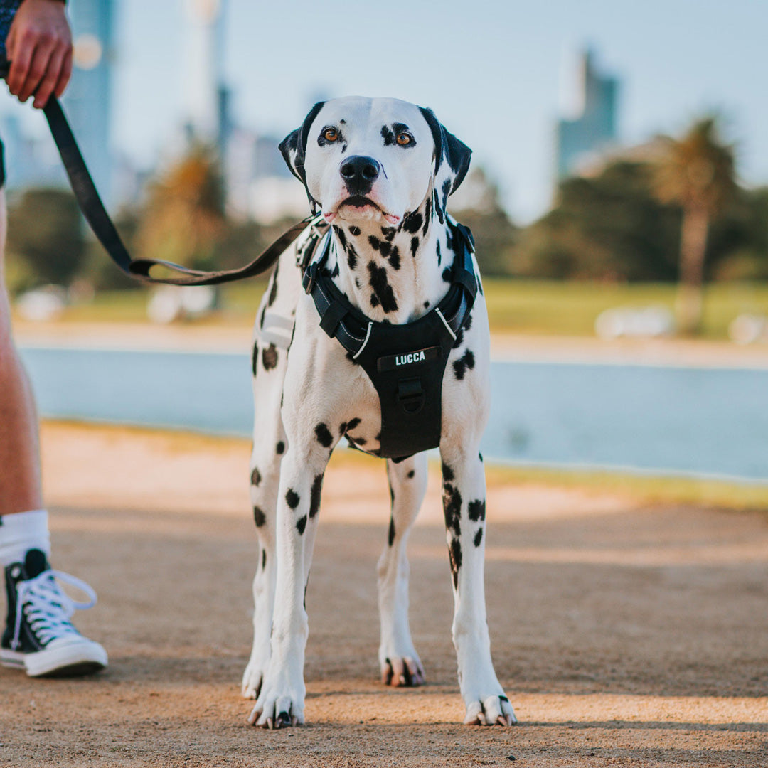 • 2 front attachments and one back attachment for any walk style • 1 leash leg tangle free attachment • Adjustable Straps & Lockable buckles • Handle on the back • Reflective binding and strap detail • Includes velcro patch for nameplates on the front and back