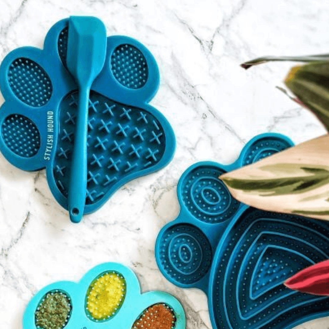 ⭐⭐⭐⭐⭐ "Great boredom buster! Spread some doggy yoghurt, blueberries and tasty treats on the mat with the cute matching spatula, chuck it in the freezer and my Great Dane is occupied for a long-time licking!" - Amy A