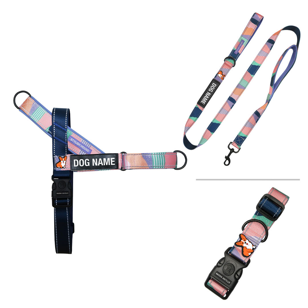 • All materials (straps, plastic buckles, metal hardware) are made from 100% recycled materials • The front chest attachment discourages pulling with an optional back attachment • Includes a pair of matching Padded Buddies • Adjustable chest and belly strap • Padded neoprene handle for when you need to get a hold of your dog quickly. • Double-sided print design. • Auto-lock black buckle. • Sturdy and thick hardware.
